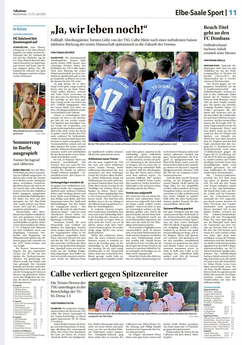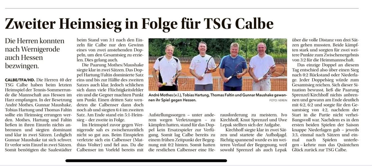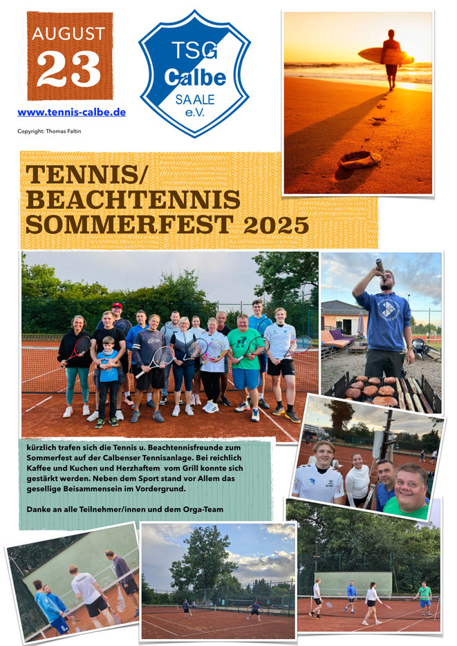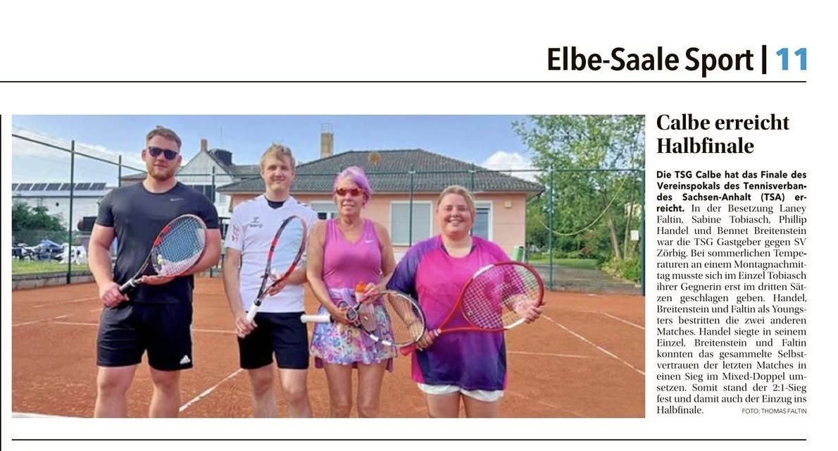 Als Abteilung der TSG Calbe Saale e.V. sind wir Teil eines der größten Sportvereine des Salzlandkreises. Unsere idyllische Anlage mit modernem Clubhaus liegt im Saalebogen der Rolandstadt Calbe/Saale. Diese Internetpräsenz soll informativ sein und zugleich Lust auf den Tennissport machen.